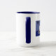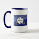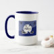 La taza del Día del Padre, un guarnecido del círculo blanco en azul con Feliz Día del Padre en el medio, tiene a papá y a los niños zapatillas blancas y negras. El fondo tiene tonos azules con estrellas y corazones, la manija y el borde de la taza es azul marino.