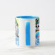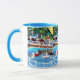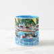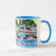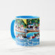 Una taza blanca de buena calidad con un borde y mango azul en polvo y un diseño de collage de papel pintado a mano de un pequeño puerto con barcos de pesca y gaviotas. Vea también la tarjeta de felicitación, regalos y prendas de vestir.
