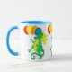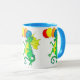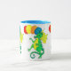 Una taza colorida con dragones verdes y amarillos, cargando globos, de una pintura acuarela de Judy Adamson.