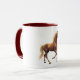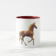 Esta elegante taza de cerámica tiene un diseño geométrico impresionante de caballos, hecho con líneas limpias y formas triangulares.