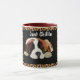 Bonita taza de café de mañana tranquila con tu lindo San Bernardo y patrón de repetición. El marrón rojo realza la manija y el interior. Se encuentra el cachorro echando una siesta sobre un fondo de negro. Los cachorros patrón duermen sobre amarillo para iluminar la taza. Es un gran regalo para un padre, marido, hijo, hermano y amante de San Bernardo. Diseñado por AbuNana.com.