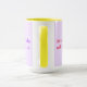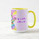Esta imagen muestra a un gato colorido y estilizado sobre sus patas traseras. El cuerpo del gato está dividido en secciones vibrantes, multicolores, con contornos en negrita y una variedad de patrones abstractos. Sus grandes ojos azules y su expresión alegre le dan un aspecto caprichoso y juguetón. El estilo artístico puede describirse como arte pop con elementos de ilustracion digital moderno, con colores brillantes y contrastantes y una estética caricaturista, casi surrealista. El fondo incluye formas abstractas y tonos pastel, que complementan el diseño dinámico y animado del gato. Este diseño incluye el dicho "La vida es mejor con un gato" en ambos lados del diseño. El dicho es personalizable.