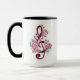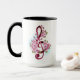 Pink treble clef with delicate, detailed pink Japanese cherry blossoms against white background painted over with light blue paint. Blooming pink sakura.