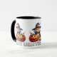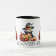 ¡Vaya! Añade un capricho a tu mesa festiva con esta taza de felino de Halloween. La obra de arte incluye un gato de tabernita con un traje de bruja. Su linterna Jack-o-lantern tiene un pequeño gatito lindo mirando desde lo alto de la calabaza. El verso dice: "¡Feliz Halloween Jennifer!" Personalice esta taza de gato agregando su nombre de seres queridos o su propia frase.