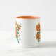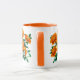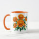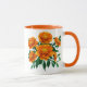 Mug en un ramo de marigolas naranjas con centros amarillos dorados y hojas verdes