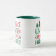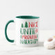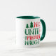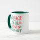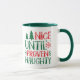 "Niza hasta probada traviesa" dice el texto rojo y verde en esta taza. Junto con el texto afligido brillante están los pinos verdes y los copos de nieve rojos. La imagen se imprime dos veces en la taza.
