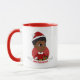 Navidades atragantan con el ilustracion de un lindo sonriente chica afroamericano con un peinado afro, el chica está usando un disfraz de Santa Cláusula con un gorra rojo y sosteniendo un regalo; en un círculo rojo sobre un fondo rojo, con una plantilla de texto editable para su nombre o mensaje