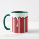 Las rayas de caña de caramelo rojo, blanco y verde contrastan con las gotas de chocolate caliente en esta taza de vacaciones. Los diseños son de arte original.