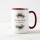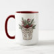 Conos de pino y ramas de pino en una cesta de Buffalo Plaid, una casa de campo de Navidades de lujo, tazas de café.