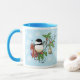 Chickadee lindo sentado en una rama de árbol en invierno con copos de nieve cayendo por todos lados. Los adornos navideños están colgando de la rama del árbol en la que está sentada la chica.