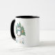 Esta divertida y humorística taza de Navidades muestra un pingüino dibujado a mano, con un gorra y una bufanda de azul verde azulado. Está parado frente a algunos árboles de Navidad y sosteniendo una galleta de pan de jengibre. El texto de la obra dice: "Es pingüino parecerse mucho a Navidades", con la palabra NAVIDADES con letras coloridas. ¡Genial para los que aman los juegos de palabras!
