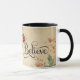 La taza de navidad representa una hermosa floral vintage con un poinsettia rojo y vegetación sobre un fondo beige. Presenta una simple pero poderosa cita cristiana inspiradora para "creer".