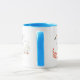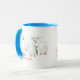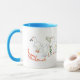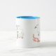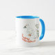 Una taza blanca con un mango y una llanta azul en polvo y un diseño de gansos, cargando una hiedra, hiedra y mistletoe, de una acuarela pintada a mano por Judy Adamson. También hay disponible una tarjeta de Navidades con el mismo diseño.