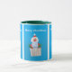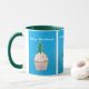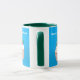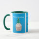 Una taza de ringer blanca y festiva con un borde y mango verde y paneles de azul brillante con Feliz Navidad en blanco, justo debajo del borde. En cada panel hay un bizcocho, coronado con escarcha blanca y hueca, un árbol de Navidad con luces y una estrella y un Padre Navidad!