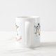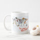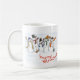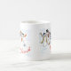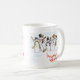 Una taza de ringer blanca con un borde y mango azul en polvo y cinco muñecos de nieve en la parte delantera y trasera, con un diseño acuarela pintado a mano por Judy Adamson. Este diseño también está disponible como tarjeta de Navidad.