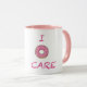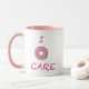 No me importa (No me importa) Empieza tu día con una sonrisa y un sorbo de este delicioso "Me importa Donut Mug". Esta encantadora taza muestra la edificante frase "Me importa" con un lindo gráfico de donut rosado que toma el lugar de la 'O' en "Donut". Es una forma caprichosa de disfrutar tu café o té matutino y un dulce recordatorio de que te importan, incluso las pequeñas cosas de la vida. Con su diseño lúdico y su mango rosa pastel, esta taza es perfecta para regalar regalos o como una alegre adición a su propia colección de tazas.