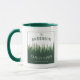 Un hermoso tazón de café de dos tonalidades con su nombre familiar personalizado y la cabaña, lodge u otro texto deseado y su ubicación. Este diseño personalizado cuenta con obras de arte de una silueta de bosque de pinos en tonos de bosque y verde cazador. Siéntase libre de visitar mi tienda de diseño para ver más artículos y diseños como este. ¡Gracias.
