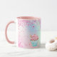 Un fondo holográfico e iridiscente de moda con colores unicornios y colores arcoiris en rosa, violeta, verde menta. Decorado con confetti en rosa y 3 quequitos. Personaliza y agrega tu nombre. El nombre está escrito con un guión moderno de estilo con letras a mano con toques. Para que los cambios sólo eliminen el nombre del ejemplo, deje los espacios o la emoji delante y después del nombre.