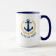 Un tazón de café grande de 15 onzas personalizado de dos tonos con su nombre de barco, nombre de familia u otro texto deseado. Con un ancla náutica diseñado por un personalizado, hojas de laurel de estilo dorado y emblema de estrellas. Hay varios colores de acento para elegir entre la decoración actual. Hace un gran regalo para cualquier ocasión.