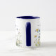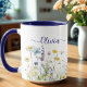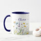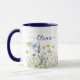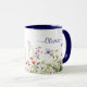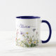 Nombre personal del guión personalizado Coffee Mug. Un prado lleno de flores silvestres acuáticas, mariposas y libélula. El nombre en ambos lados está en un tipo de letra con melocotón, con remolinos/glifos adjuntos a cada lado del nombre para un toque femenino. Puedes mantenerlos o borrarlos. Intente escribir su nombre entre los iconos cuadrados y vea antes de decidir. Esta es una taza femenina perfecta como un regalo reflexivo o para ti mismo hacer tu taza favorita personal para la oficina o en casa. Lo guardará usted mismo.