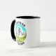 tazón de café azul y verde con un ambiente retro vintage que muestra un esqueleto en un disco de sombrero de sol jugando golf en el bosque con la frase 'Nunca demasiado viejo para jugar al golf en disco".