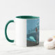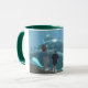 Esta interpretación painterly de dos niños como miran dos ballenas de la orca nadar pasado tiene una calidad pacífica, soñadora.