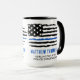 Presentamos la taza de café perfecta para los oficiales de policía y agentes del orden, con el icónico diseño de la bandera estadounidense y la Línea Azul delgada. Esta taza es una gran manera de mostrar su apoyo a aquellos que sirven y protegen a nuestras comunidades. Personaliza tu taza con tu nombre y departamento para que sea realmente único. Es una fantástica idea de regalo para una academia de policía o durante la semana de aprecio policial. Esta taza de cerámica de alta calidad está equipada con microondas y lavavajillas, por lo que es ideal para el uso diario. En él se sirven bebidas frías o calientes, perfectas para una cafeína en esos largos turnos. Muestra tu orgullo y apoyo a nuestros valientes oficiales de policía con esta taza personalizado. ¡Pida el tuyo hoy mismo y disfruta de tu café matutino con estilo! DERECHOS RESERVADOS © 2020 Judy Burrows, Black Dog Art - Todos los derechos reservados. Bandera delgada de la línea azul oficial de policía Mug