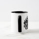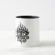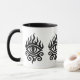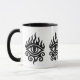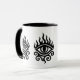 Esta es una elegante taza blanca con mango negro y llanto, con un llamativo diseño de ojos al estilo tribal en negro. El ojo está rodeado de llamas y intrincadas líneas tribales, que simbolizan el poder y la visión de una manera llamativa y artística. 🔥 👁