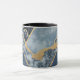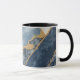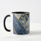 La imagen es un arte abstracto visualmente cautivador que combina formas geométricas y patrones de ondas orgánicas. El diseño presenta una combinación armoniosa de triángulos, rectángulos y formas irregulares, todo delineado con líneas doradas delgadas. La paleta de colores está dominada por varios tonos azules, que van desde la marina profunda hasta el azul celeste claro, complementados con manchas de oro texturado. La interacción entre el azul frío y el oro cálido crea un sorprendente contraste que añade profundidad y riqueza a la composición.