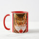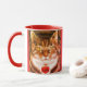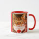 Striped cat on mug with red trim. Art by Patricia Villa.