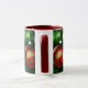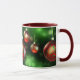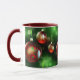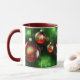 Imagen de adornos de navidad rojos lujosos decorados con oro artístico y rollos purpurinas verdes, mientras cuelgan en cinta verde frente a un fondo abstracto de vegetación y luces Navidades. ¡Haz que tu taza matutina sea alegre!