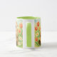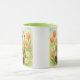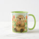 Una taza con un ilustracion acuarela de una divertida nutria marina sosteniendo una flor rosada de margarita, con tulipanes de primavera y margaritas blancas a su alrededor