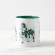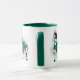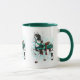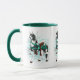 He amado a los carruseles desde que era niño. Los hermosos diseños de los animales y la música de los carruseles instalados en ferias y parques ocupan un lugar especial en mi corazón. Esto me inspiró a dibujar unos caballos de carrusel propios, luego colorearlos con tinta acrílica. La acuarela de un caballo de pintura blanco y negro decorado en verde que aparece en esta taza es uno de los resultados.