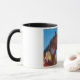 Fotografía de un verdadero Paint Horse como Pony de Guerra, con arte de mano y plumas coloridas, mostrada en un Mug.