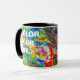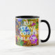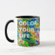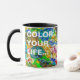 Vista macro de una paleta de colores con una mezcla de pintura al óleo de diferentes colores. La pintura abstracta clara y colorida es esta paleta como es. Sólo un arcoiris de pintura al aceite de colores. - En nuestra vida, hay un solo color, como en la paleta de un artista, que proporciona el significado de la vida y el arte. Es el color del amor. (Marc Chagall) Graciosa taza de personalizable. Puedes cambiar o borrar dos textos de plantilla: Color tu vida... y Pero deja el café negro.