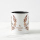 Una corona de otoño de bonito en tonos marrones, canela y crema rodea la imagen de un hermoso caballo palomino. La imagen se imprime dos veces en la taza, con el texto de su personalizado entre ellas. Haz que diga lo que quieras, o elimina fácilmente el texto por completo.