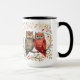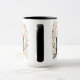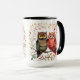 En esta singular taza, dos búhos con patrones de estilo boho se unen en una rama de árbol. Un búho es verde y dorado; el segundo lechón es rojo/naranja y oro. Están rodeados de hojas de otoño de oro y verde. La imagen se imprime dos veces en la taza.