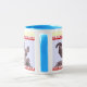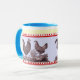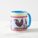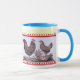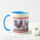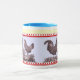 Taza única que ofrece una imagen antigua de un pollo y de un gallo. El texto se puede añadir a la banda amarilla en el top si está deseado.