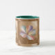 Esta taza presenta un ilustracion de arte digital de una flor estilizada con cinco pétalos contra un fondo dorado metálico delgado. La flor tiene un esquema de color degradado de azul turquesa en los bordes exteriores, a través del rosa suave, hasta lavanda violeta en el centro. Los pétalos tienen una textura suave y fluida con estriaciones sutiles y resaltados. El centro de la flor contiene delicados estambres dorados. Unas líneas doradas curvadas y delgadas irradian hacia el exterior desde el centro de la flor, creando un efecto decorativo. El fondo tiene una textura metalizado cepillado con variaciones de tonos toscos y dorados. La taza es una peluca combo con un interior verde cazador y mango.