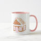 Una casa de jengibre muy agradable con una glicinia blanca nevada y adornos de caramelos pastel. ventanas de color rosa bonito y una puerta abovedada en un marco marrón de canela.