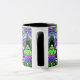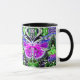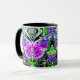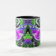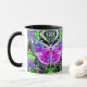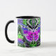 tazón de café en un patrón de batik digital de grandes mariposas sobre un fondo medallón arabesco ornamentado, en tonos violeta violeta, azul y verde sabio