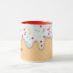 ¡Aquí hay una taza divertida que hace un gran regalo de cumpleaños cuando se llena de los dulces favoritos del destinatario! El patrón es un fondo de cono de gofre con hielo blanco. La guinda del pastel la llenan de puntos de confeti coloridos. Un lado tiene un nombre personalizado en rojo.