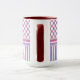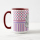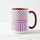 Una imagen de un gato dormido gris con una sonrisa en su rostro contra un patrón rosa, púrpura y gris es un diseño único para los amantes de los felinos.