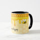 Añade algo de diversión y humor a tu casa de verano o espacio de trabajo! Fondo amarillo y blanco con un patrón de abeja y abejas sonrientes felices. Decorada con miel de goteo. Texto de color negro: Bee Happy