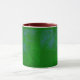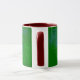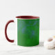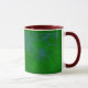 Ilustracion vintage de una rama de pino con pineconas sobre un fondo de verduras y azul sobre una taza de café que se puede personalizar.