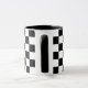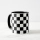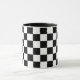 Estilish mug presenta un audaz patrón a cuadros negros y blancos, hecho de filas de cuadrados blancos y negros alternantes, como en una bandera de carreras. La taza tiene un mango negro y el interior que se puede personalizar en la barra lateral.