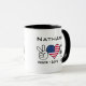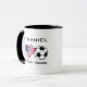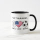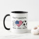 Esta taza es un gran regalo para un hincha de fútbol estadounidense. El diseño incluye un signo de la mano de la paz, una bandera estadounidense en forma de corazón y una pelota de fútbol con las palabras "Peace Love Soccer". Para hacer la taza aún más especial, personalizarla con el nombre del destinatario.