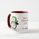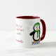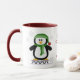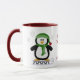 Aquí hay un lindo tazón de Navidad que incluye un pingüino dormido y tu propio texto personalizado. El pingüino está vestido con una bufanda verde y un gorra. Está cosiendo sobre su lomo, y unos cuantos copos de nieve se escurren a su alrededor. La imagen se repite dos veces, con tres campos de texto para el texto de su personalizado en el medio. Perfecto para los niños grandes y pequeños durante la temporada de Navidades.