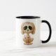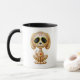 Este diseño marrón adorable del perrito se adorna con remolinos y modelos de punto. La flor amarilla pedals círculo los ojos morados puros en la tradición del día de los cráneos muertos del azúcar. El pequeño perro se está sentando, mirando adelante con su cola que agita en el fondo. La cabeza de gran tamaño se sienta en un cuerpo minúsculo que cree un juguetón, dibujo animado como aspecto. Una estrella de cinco puntos se sienta en el medio de la frente del perrito mientras que un corazón rojo y amarillo brillante aparece en el centro del pecho. Este pequeño perrito lindo es una diversión y un diseño elegante inspirados por los modelos hermosos del día de los cráneos muertos del azúcar.