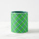 Un tazón de café con un patrón fresco de cestería verde con pequeñas rayas blancas y azules.